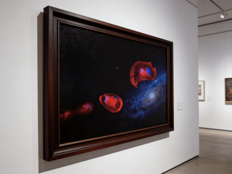 《巨噬细胞骨架》与《成纤维细胞》是系列中的代表作品,让观众直观感受到微观生命的震撼之美。王资隆介绍,巨噬细胞是机体免疫系统的核心,其骨架是免疫防御的关键结构,团队借助特异性荧光染色技术,让红色荧光勾勒的骨架脉络在暗调背景下舒展,既精准还原细胞真实结构,又宛若宇宙星云,尽显微观生命的精巧;杨长江解读的成纤维细胞作品,则通过双色荧光染色标记细胞核与细胞质,紫蓝色的细胞核如星系内核,荧光绿的细胞质似银河旋臂,让科学的严谨与艺术的浪漫相互呼应。