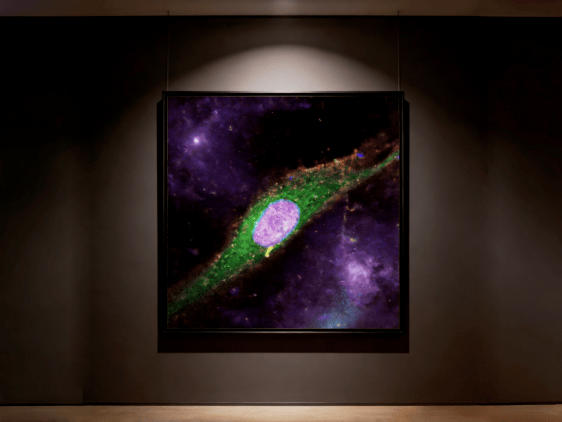 在繁忙的科研工作间隙,两人以高精度显微成像为媒介,以荧光染色为“画笔”,将肉眼无法窥见的细胞结构,转化为兼具科学严谨性与艺术冲击力的视觉作品。系列作品聚焦单个细胞,通过精妙的成像与染色技术,营造出浩瀚宇宙般的视觉观感,在微观生命与宏观宇宙之间搭建起诗意桥梁,让冰冷的科研数据与实验,绽放出浪漫的艺术光彩。